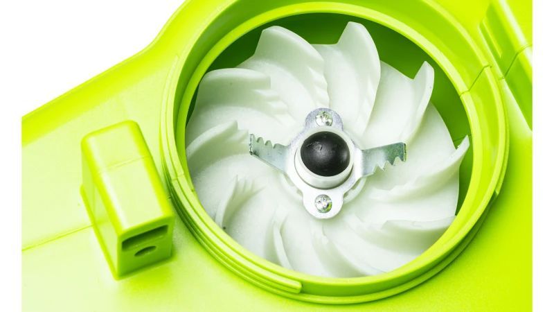 На этом устройстве установлен мощный электродвигатель с потреблением 3 КВт. Воздуходув имеет регулятор скорости воздушного потока. Для мульчирования листвы в саму турбину встроены стальные зубчатые ножи. Для безопасности предусмотрена защита от случайного попадания предметов в лопасти крыльчатки. Ручка воздуходува имеет эргономичную форму и прорезинена.