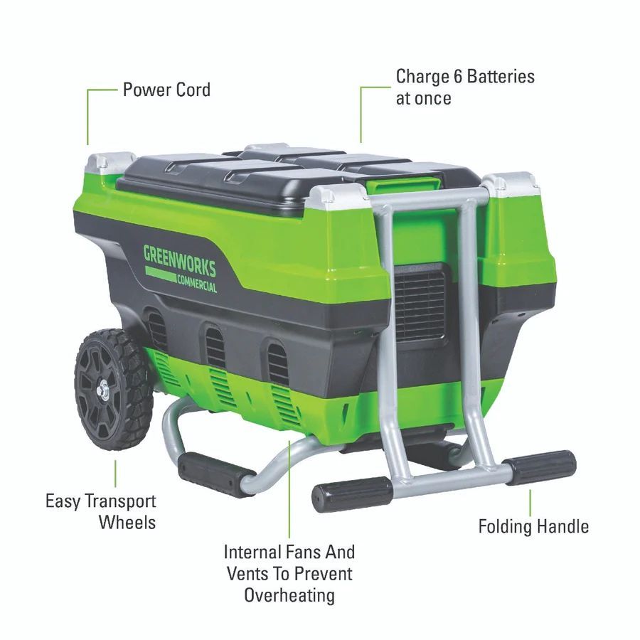 Заряжает до шести аккумуляторов Greenworks 82 В одновременно. Встроенный вентилятор предотвращает перегрев, а контроллер защиты от перезарядки обеспечивает безопасность. Светодиодный индикатор показывает уровень заряда, а конструкция в виде тележки с колесами и складной ручкой делает устройство мобильным.